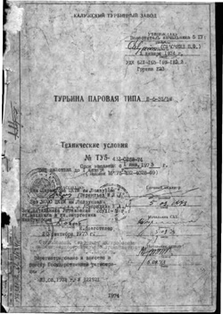 Турбина паровая П-6-35-5М. Технические условия ТУ 5-432-0288-74 Настоящие технические условия распространяются на установку стационарных паровых конденсационных турбин с регулируемым отбором пара, предназначенных для привода синхронного электрического генератора типа Т-6-2 мощностью 6000 кВт с частотой вращения 3000 об/мин, изготовляемых ЛТГЗ заводам, монтажный чертёж 6ВЖ.000.607МЧ, монтируемых на общем фундаменте с турбиной. Поставка ...